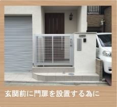 玄関から道路までの限られた空間に、門扉を設置したい。とのご要望でした。現地へお伺いすると、足元には点検口の桝も多く、設置できるか不安でした。